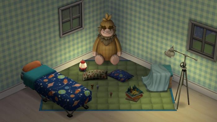 Desafortunadamente, hay un par de obstáculos. Para empezar, la caja Smores no es un artículo de comida, y las almohadas del piso son solo para decorar: los Sims no pueden sentarse en ellas. Las cadenas de luces de hadas también son un poco extrañas, ya que no son un elemento de pared. Parece que solo logramos que se vean bien cuando se colocan junto al frasco colgante de Firefly. La mesa de actividades para niños tampoco ofrece nada nuevo y es una nueva versión de los escritorios anteriores.