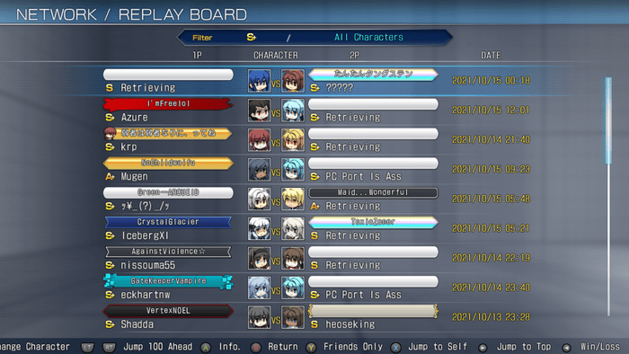 Alternativamente, los jugadores pueden consultar el tablero de reproducción en el modo de red para ver las repeticiones de otros cargadas públicamente. Las repeticiones se pueden ordenar por rango y por personajes si los jugadores necesitan ser específicos en el metraje que quieren ver. Los jugadores de todos los rangos se pueden ver aquí, siempre que haya imágenes cargadas del partido.