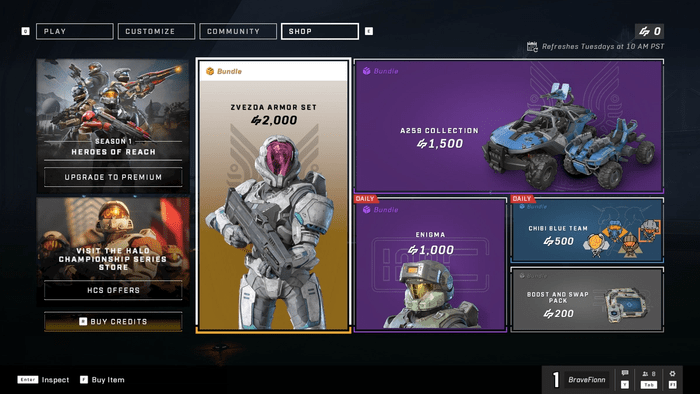 La tienda Halo Infinite está abierta al público, con una variedad de artículos cosméticos a la venta si tiene los créditos para gastar y la voluntad de comprar. La tienda se actualiza una vez a la semana, pero cada día tiene un conjunto especial de ofertas destacadas. También hay una variedad de artículos de campeonato, cosméticos relacionados con equipos de deportes electrónicos populares como FaZe y Fnatic.